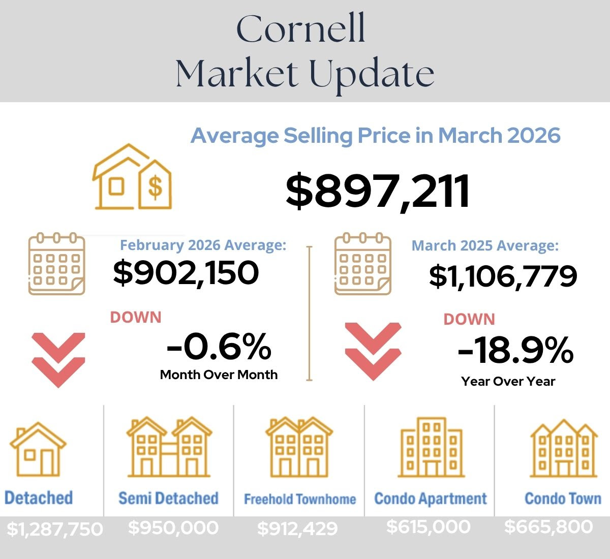 The Cornell housing market softened further in November 2025. The average selling price declined to $946,306, down 6.89% month-over-month from October and 16.91% year-over-year compared to November 2024. Detached homes remained the highest-priced segment at $1,272,378, while semi-detached properties averaged $975,000. Freehold townhomes sold for $901,333, condo apartments averaged $550,000, and condo townhomes came in at $615,333. Overall, November reflected a continued cooling trend, with broader price pullbacks across most housing types as buyer caution increased heading toward year-end.