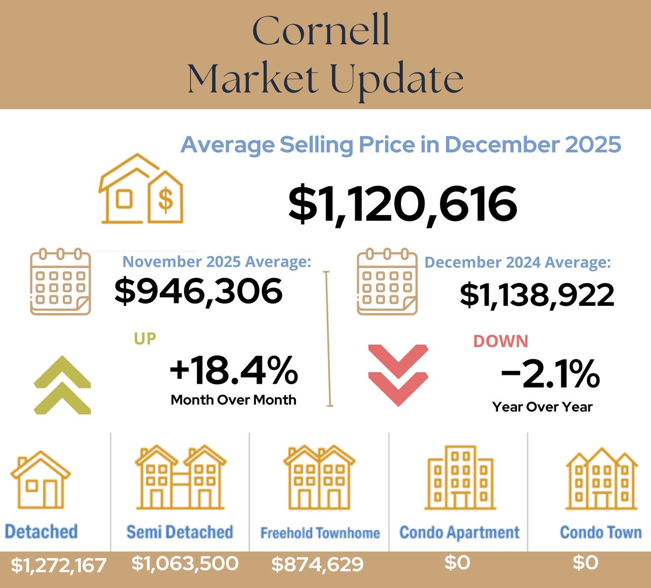 The Cornell housing market rebounded strongly in December 2025. The average selling price increased to $1,120,616, marking a significant 18.4% month-over-month rise from November, while sitting just 2.1% below December 2024levels. Detached homes averaged $1,272,167, with semi-detached properties close behind at $1,063,500. Freehold townhomes sold for an average of $874,629, while there were no recorded sales for condo apartments or condo townhomes during the month. Overall, December reflected a sharp rebound driven by limited inventory and higher-value detached home sales, closing out the year on a stronger note despite ongoing year-over-year softness.