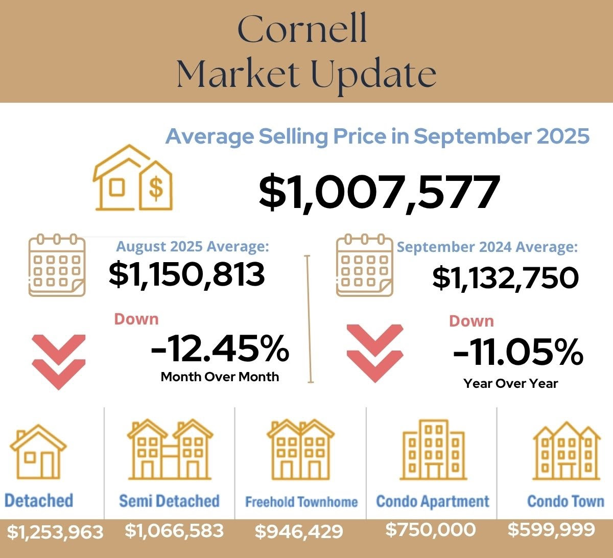 The Cornell housing market softened in September 2025. The average selling price declined to $1,007,577, down 12.45% month-over-month from August and 11.05% year-over-year compared to September 2024. Detached homes continued to lead pricing at $1,253,963, while semi-detached homes averaged $1,066,583. Freehold townhomes sold for an average of $946,429, condo apartments averaged $750,000, and condo townhomes came in at $599,999. Overall, September reflected a broad pullback across housing types, with prices adjusting after stronger summer activity and more cautious buyer demand.