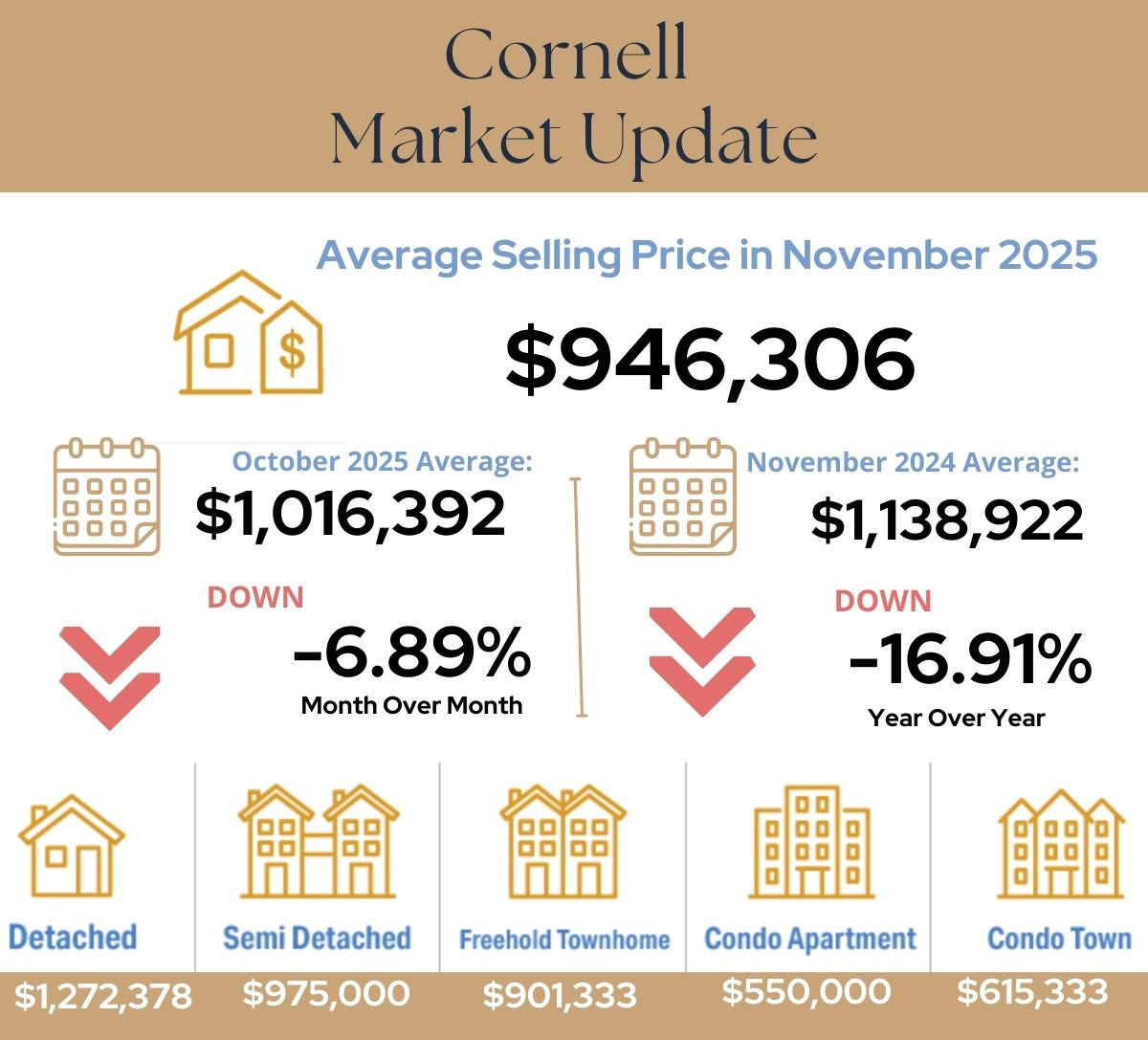 The Cornell housing market softened further in November 2025. The average selling price declined to $946,306, down 6.89% month-over-month from October and 16.91% year-over-year compared to November 2024. Detached homes remained the highest-priced segment at $1,272,378, while semi-detached properties averaged $975,000. Freehold townhomes sold for $901,333, condo apartments averaged $550,000, and condo townhomes came in at $615,333. Overall, November reflected a continued cooling trend, with broader price pullbacks across most housing types as buyer caution increased heading toward year-end.