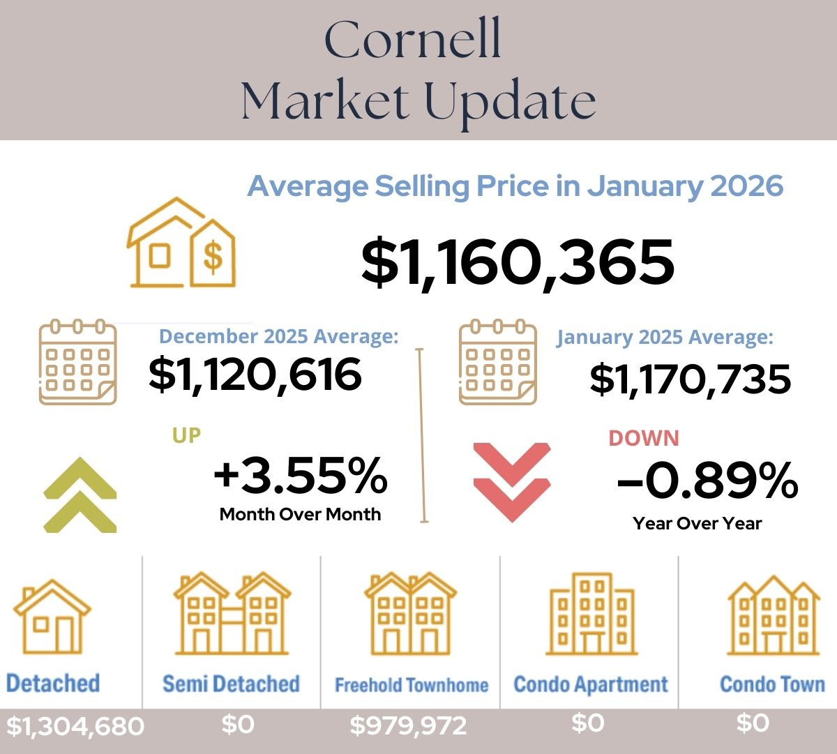The Cornell market remained relatively stable in January 2026, with the average selling price coming in at $1,160,365, reflecting a 3.55% increase from December 2025 but a slight 0.89% decrease compared to January 2025. Detached homes continued to lead the market at an average of $1,304,680, while freehold townhomes averaged $979,972, and there was limited activity in other housing types. Overall, the data suggests steady short term momentum month over month, with prices holding close to last year’s levels, pointing to a balanced market for both buyers and sellers.