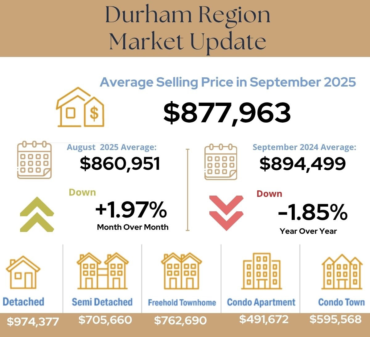 The Durham Region housing market showed signs of stabilization in September 2025. The average selling price rose to $877,963, up 1.97% month-over-month from August, while remaining 1.85% lower than September 2024. Detached homes continued to command the highest prices at $974,377, followed by freehold townhomes at $762,690 and semi-detached homes at $705,660. Condo townhomes averaged $595,568, and condo apartments remained the most affordable option at $491,672. Overall, September reflected a modest rebound in pricing after August’s dip, suggesting improving momentum heading into the fall market.