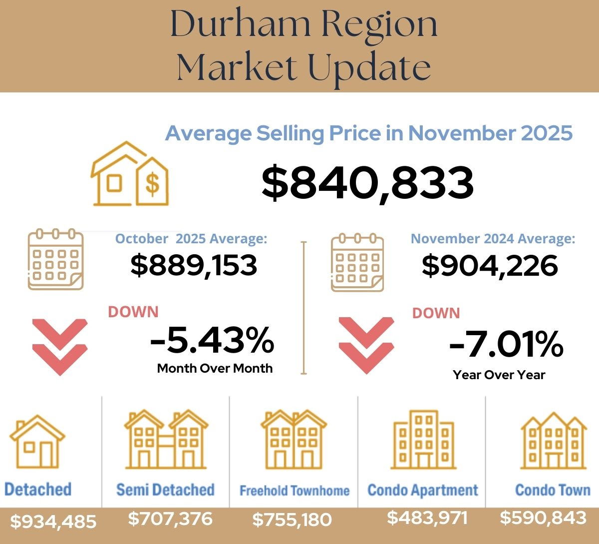 The Durham Region housing market cooled in November 2025 following October’s gains. The average selling price declined to $840,833, down 5.43% month-over-month and 7.01% compared to November 2024. Detached homes averaged $934,485, while semi-detached properties sold for $707,376. Freehold townhomes held relatively steady at $755,180, condo townhomes averaged $590,843, and condo apartments remained the most accessible segment at $483,971. Overall, November reflected a seasonal slowdown, with softer pricing as the market moved toward year-end.