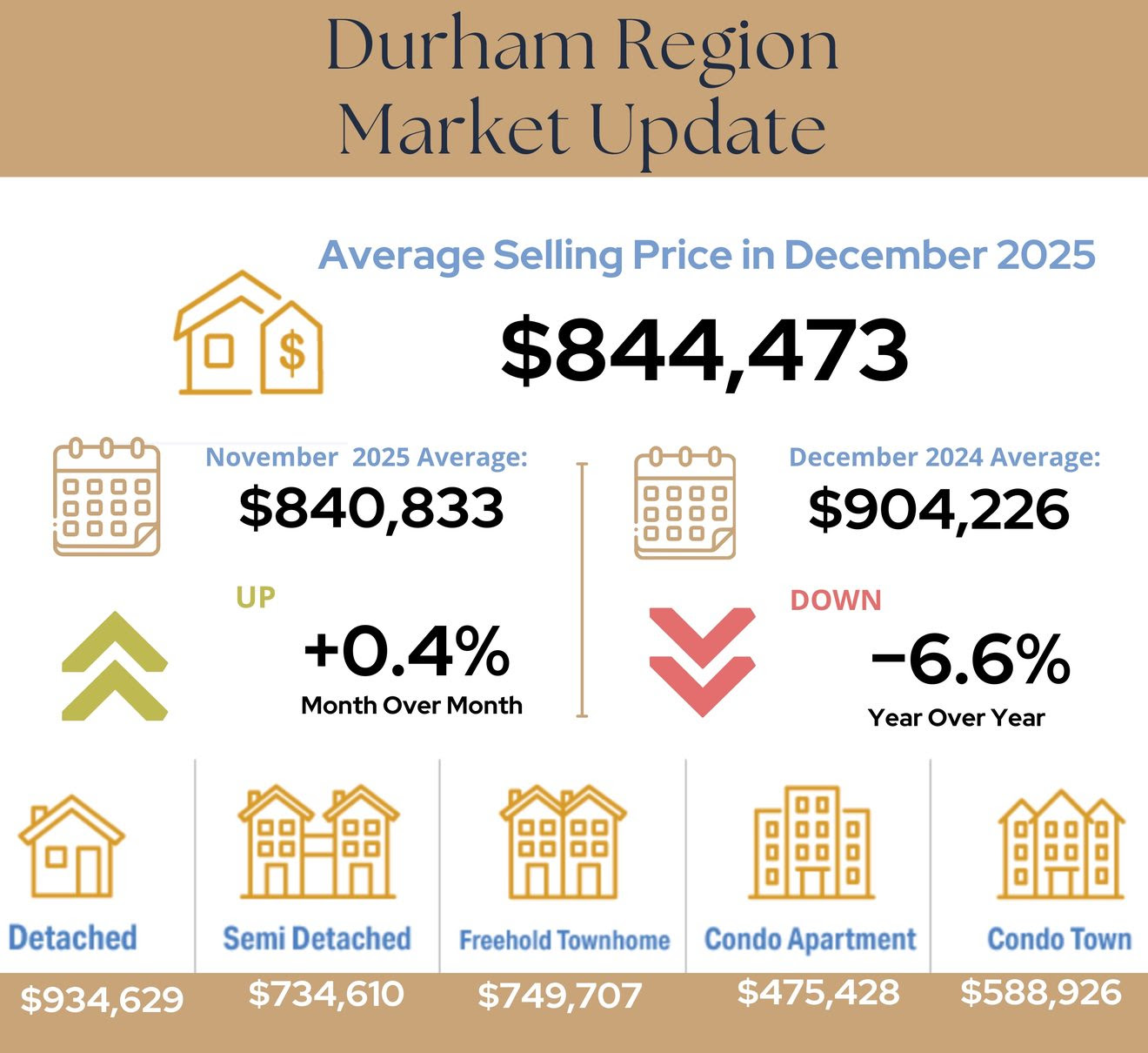 The Durham Region housing market showed slight stabilization in December 2025. The average selling price edged up to $844,473, a 0.4% increase month-over-month from November, while remaining 6.6% lower than December 2024. Detached homes averaged $934,629, and semi-detached properties rose to $734,610. Freehold townhomes averaged $749,707, condo townhomes came in at $588,926, and condo apartments remained the most affordable segment at $475,428. Overall, December reflected modest month-over-month improvement amid continued year-over-year softness as the market closed out the year.