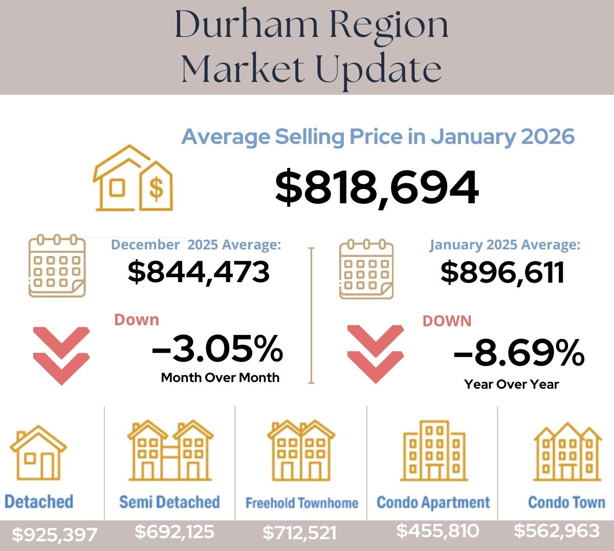 The Durham Region housing market softened in January 2026, with the average selling price at $818,694, marking a 3.05% decrease from December 2025 and an 8.69% decline compared to January 2025. Detached homes continued to command the highest prices at an average of $925,397, followed by semi detached homes at $692,125 and freehold townhomes at $712,521, while condo apartments and condo townhomes averaged $455,810 and $562,963 respectively. Overall, the data points to a cooler market compared to both last month and last year, creating more flexibility and opportunity for buyers while encouraging sellers to price strategically.