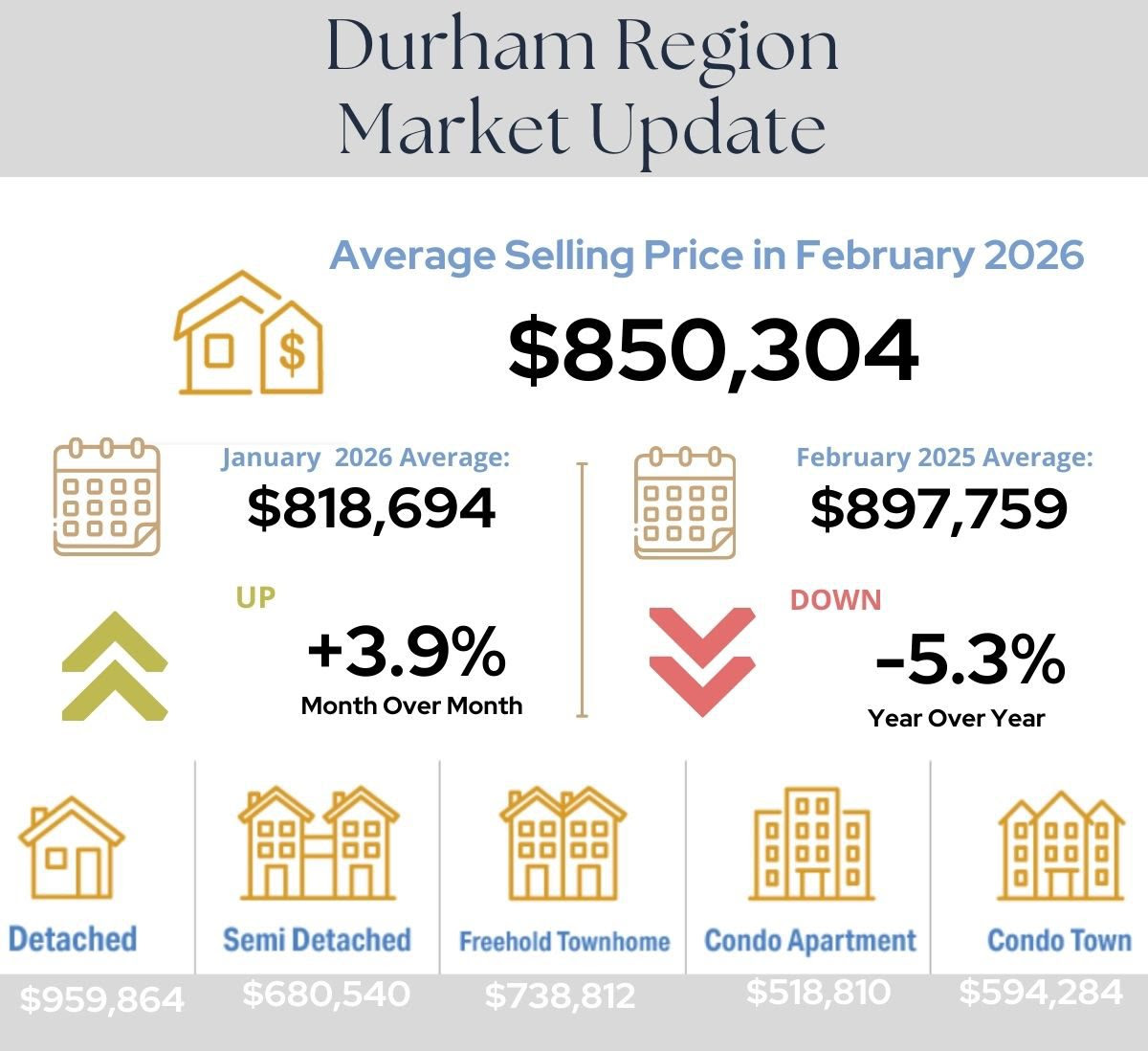 The Durham Region real estate market continued to show steady movement in February 2026, with the average selling price reaching $850,304. This represents a 3.9% increase month-over-month, suggesting gradual growth and sustained buyer activity. Despite this upward trend, prices are still down 5.3% year-over-year, reflecting broader market adjustments. Detached homes remain the highest-priced property type, while townhomes and condo apartments offer more affordable options for buyers entering the Durham housing market. As conditions evolve, Durham Region continues to present opportunities for both buyers and sellers navigating a shifting real estate landscape.