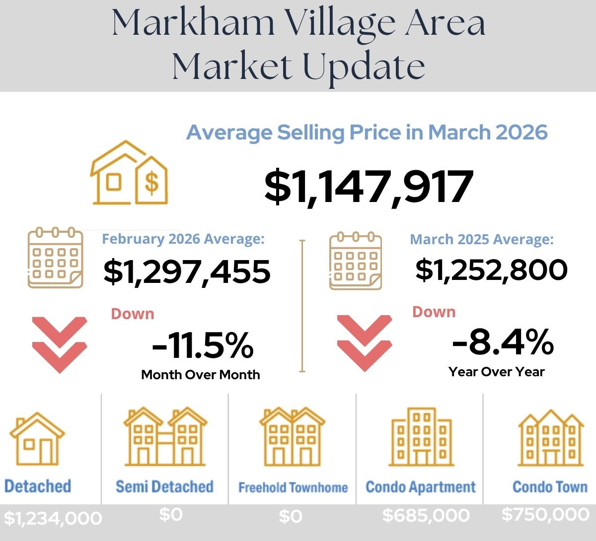 The Markham Village real estate market in March 2026 is showing a notable shift, making expert guidance more important than ever for homeowners thinking about selling. The average selling price came in at $1,147,917, representing an 11.5% decrease month over month and an 8.4% decrease compared to March 2025. While this reflects a cooling market, it also highlights an opportunity for sellers who approach the market with the right pricing and marketing strategy.