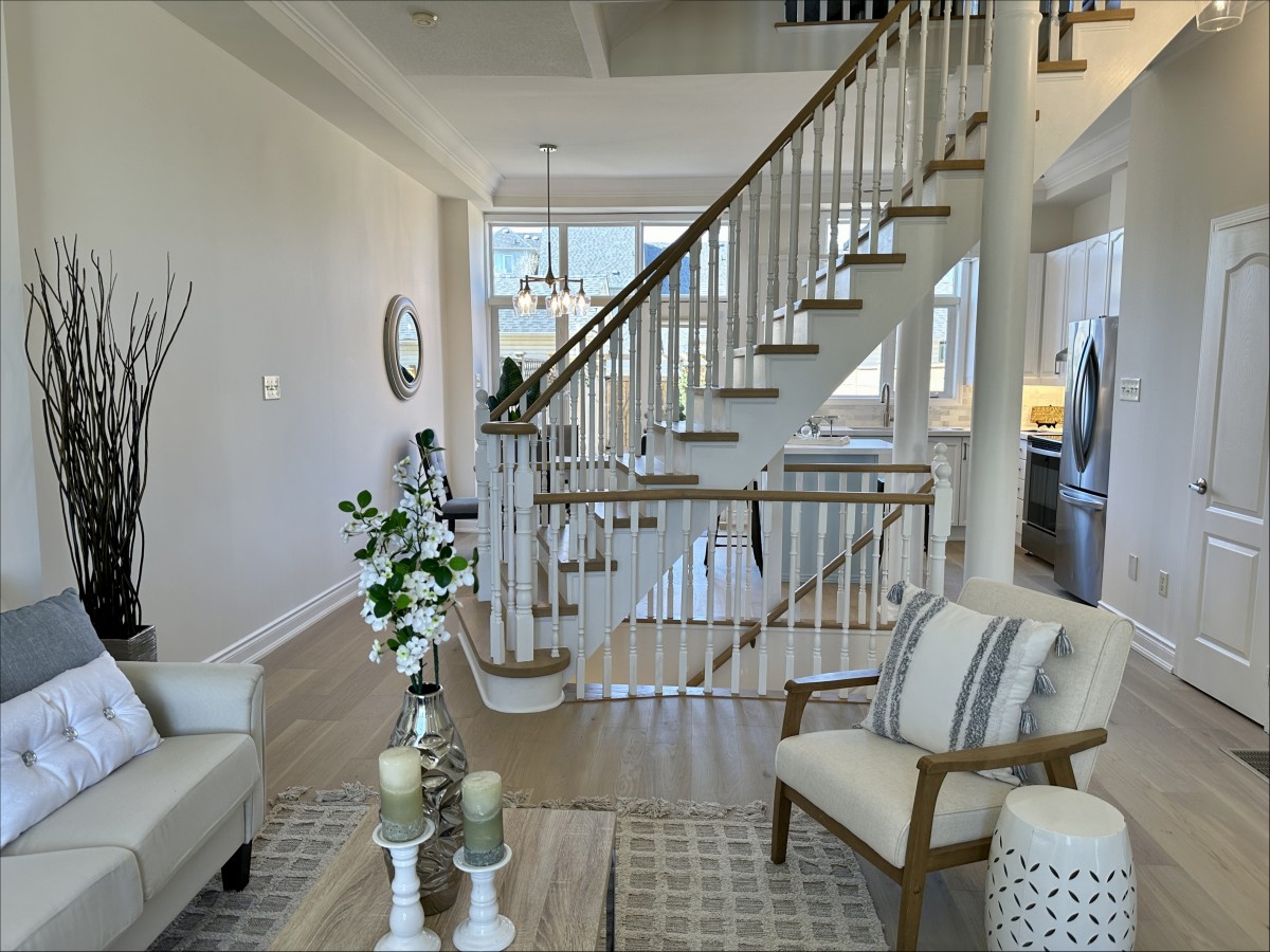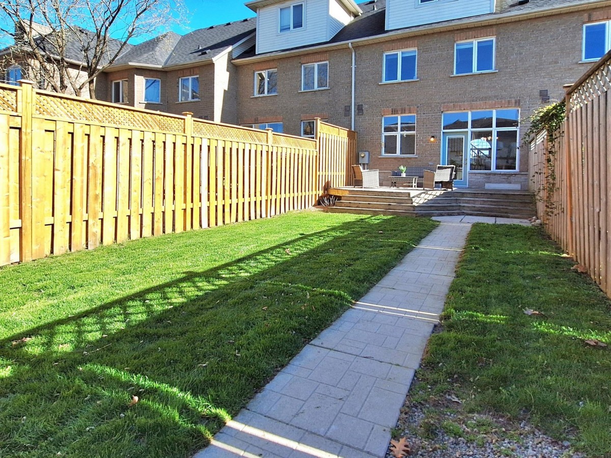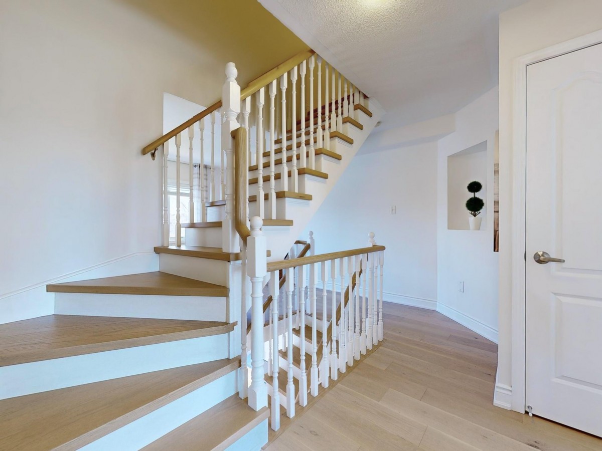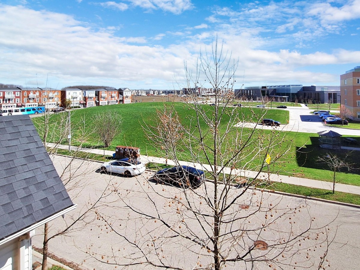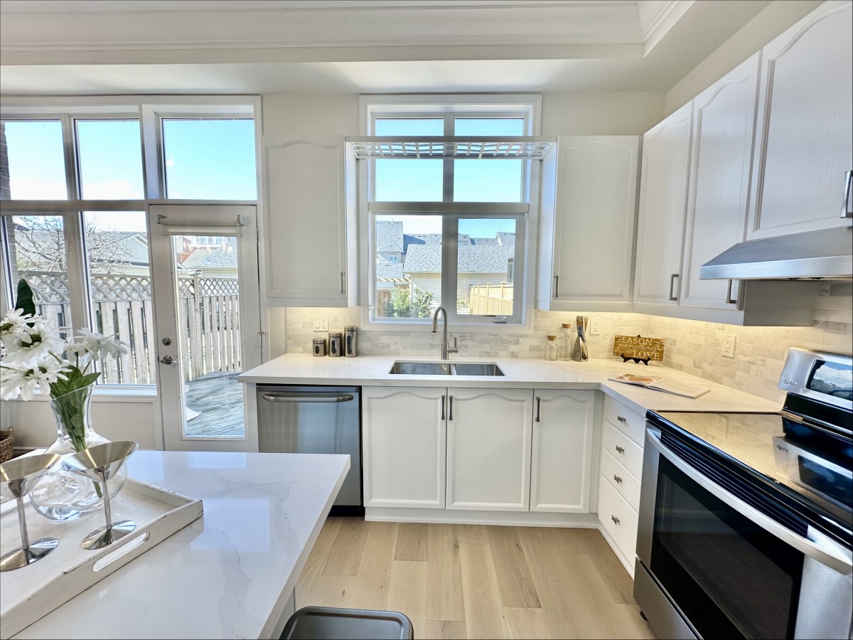 Ravishing on Riverlands That's right! You are going to want to ravish this showpiece of on-trend luxury in Original Cornell Village. This 3+1 bedroom, 4 bathroom freehold executive townhome has been fully renovated top to bottom. Enter up the stone walkway into the main floor with glorious 10 ceilings, crown moulding, and new hardwood floors. Embrace the elegant eat-in kitchen with quartz counters, breakfast bar-island, under-cabinet lighting, Carrara marble backsplash, and stainless steel appliances. Sashay up the hardwood floating staircase to a large open den - use as a home office, second family room, or wall-it-up for a fourth bedroom (builder originally offered this as an option). Also find two bedrooms and renovated 4-piece bathroom. The third floor principal bedroom retreat has a fireplace, vaulted ceiling, private balcony, and huge renovated 4 piece bathroom with soaker tub, quartz vanity, and separate shower with glass door. The basement features a finished rec room with beautiful bright 3-pc bathroom.Off the kitchen, access a deep backyard with wood deck ideal for dining and lounging. Includes a 1-car detached garage and 2 driveway.