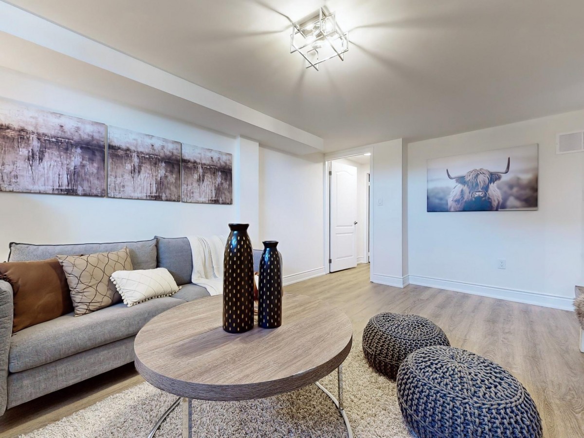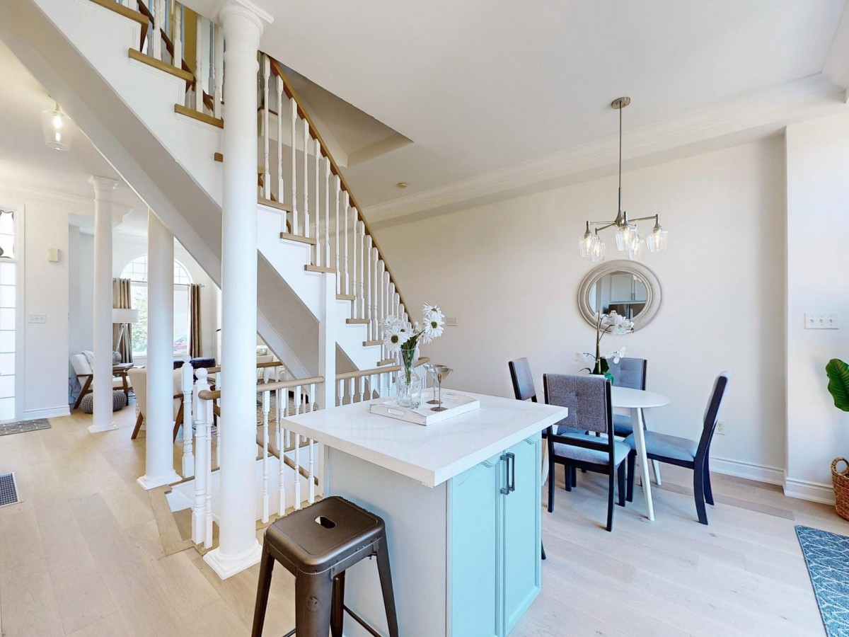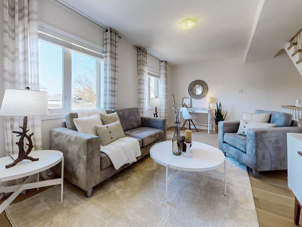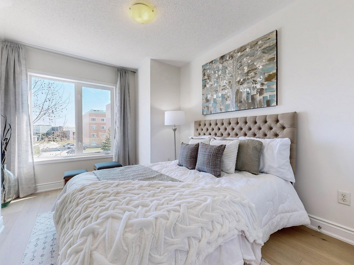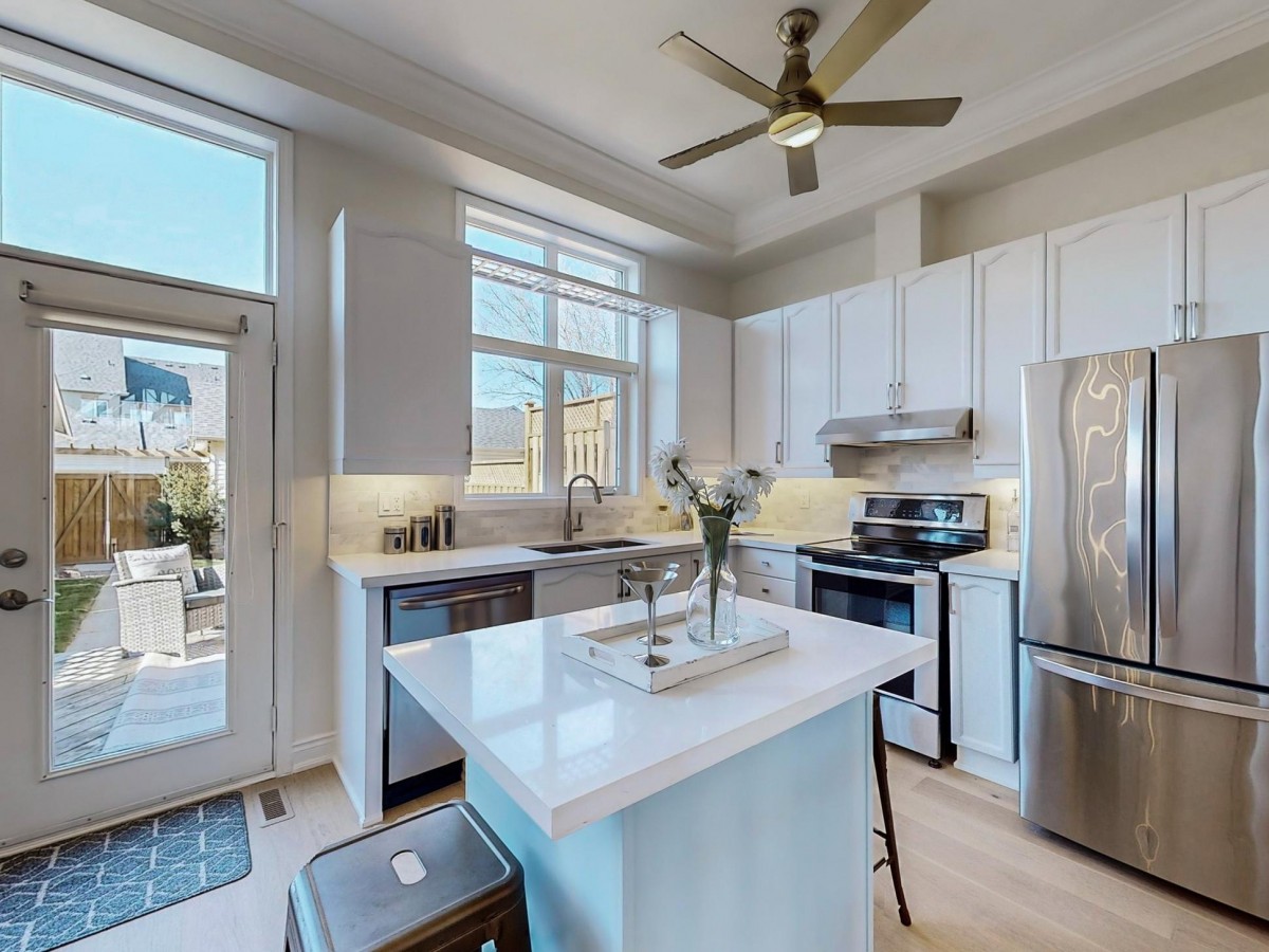 Ravishing on Riverlands That's right! You are going to want to ravish this showpiece of on-trend luxury in Original Cornell Village. This 3+1 bedroom, 4 bathroom freehold executive townhome has been fully renovated top to bottom. Enter up the stone walkway into the main floor with glorious 10 ceilings, crown moulding, and new hardwood floors. Embrace the elegant eat-in kitchen with quartz counters, breakfast bar-island, under-cabinet lighting, Carrara marble backsplash, and stainless steel appliances. Sashay up the hardwood floating staircase to a large open den - use as a home office, second family room, or wall-it-up for a fourth bedroom (builder originally offered this as an option). Also find two bedrooms and renovated 4-piece bathroom. The third floor principal bedroom retreat has a fireplace, vaulted ceiling, private balcony, and huge renovated 4 piece bathroom with soaker tub, quartz vanity, and separate shower with glass door. The basement features a finished rec room with beautiful bright 3-pc bathroom.Off the kitchen, access a deep backyard with wood deck ideal for dining and lounging. Includes a 1-car detached garage and 2 driveway.