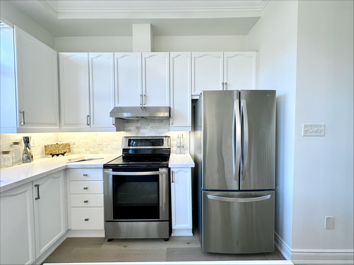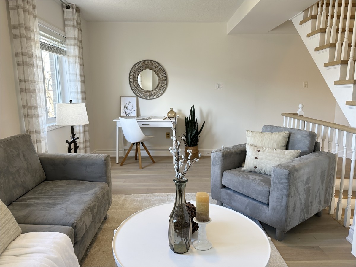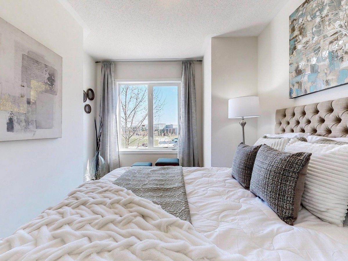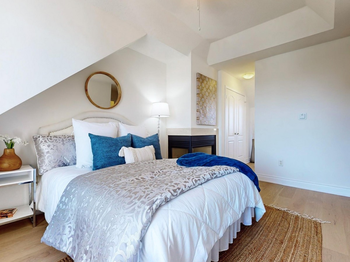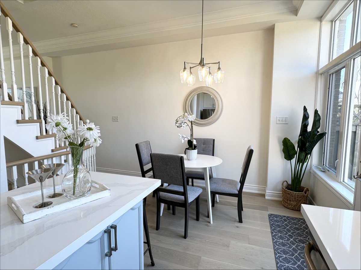 Ravishing on Riverlands That's right! You are going to want to ravish this showpiece of on-trend luxury in Original Cornell Village. This 3+1 bedroom, 4 bathroom freehold executive townhome has been fully renovated top to bottom. Enter up the stone walkway into the main floor with glorious 10 ceilings, crown moulding, and new hardwood floors. Embrace the elegant eat-in kitchen with quartz counters, breakfast bar-island, under-cabinet lighting, Carrara marble backsplash, and stainless steel appliances. Sashay up the hardwood floating staircase to a large open den - use as a home office, second family room, or wall-it-up for a fourth bedroom (builder originally offered this as an option). Also find two bedrooms and renovated 4-piece bathroom. The third floor principal bedroom retreat has a fireplace, vaulted ceiling, private balcony, and huge renovated 4 piece bathroom with soaker tub, quartz vanity, and separate shower with glass door. The basement features a finished rec room with beautiful bright 3-pc bathroom.Off the kitchen, access a deep backyard with wood deck ideal for dining and lounging. Includes a 1-car detached garage and 2 driveway.