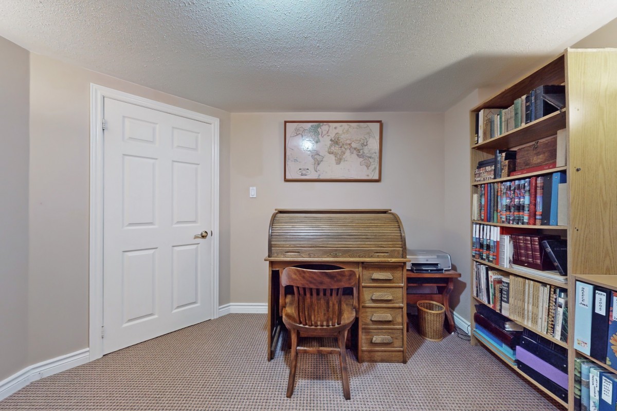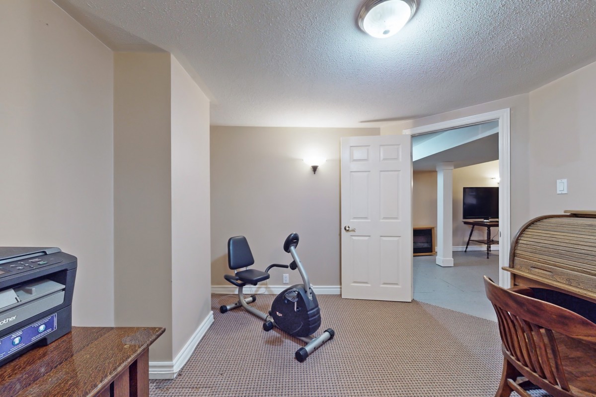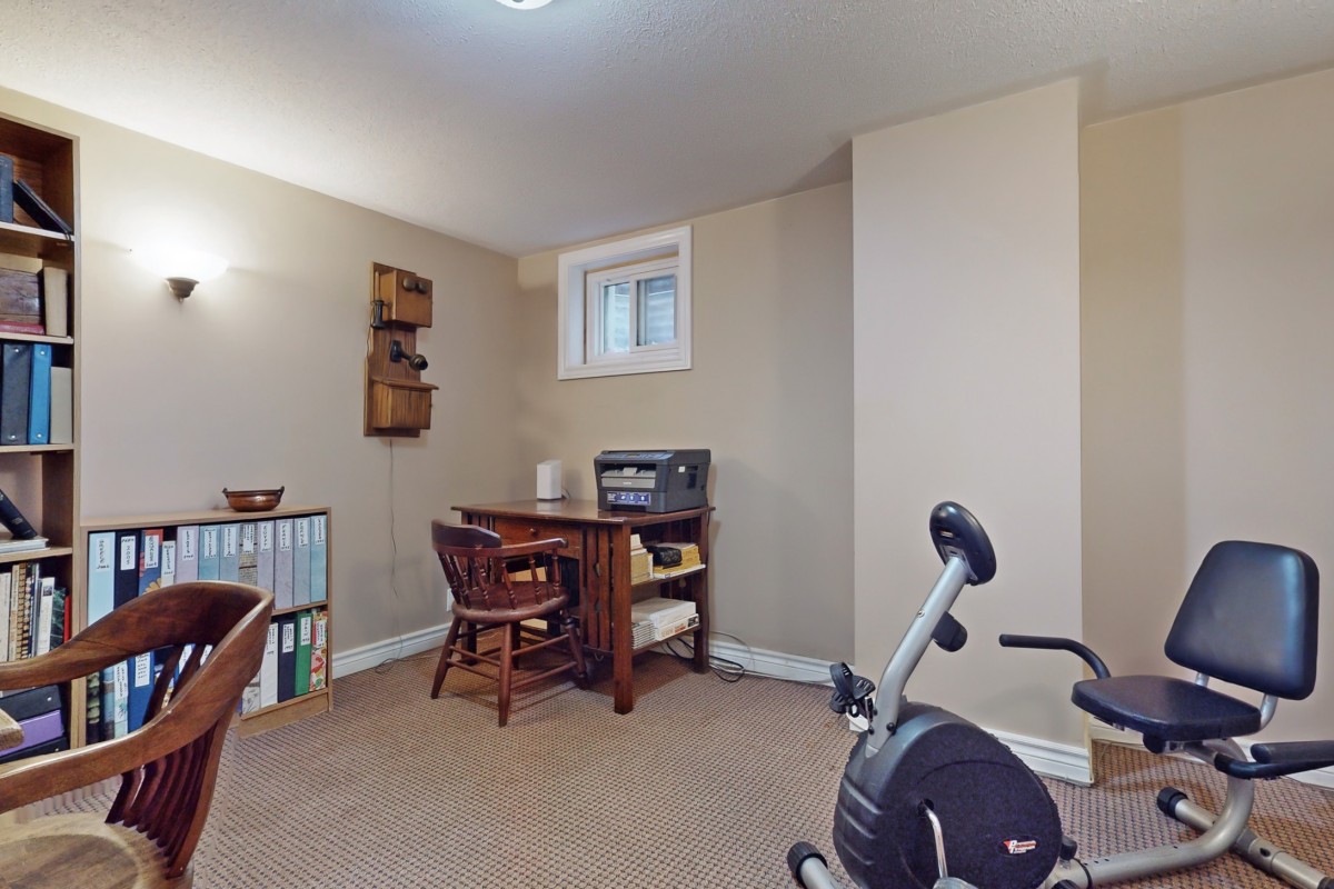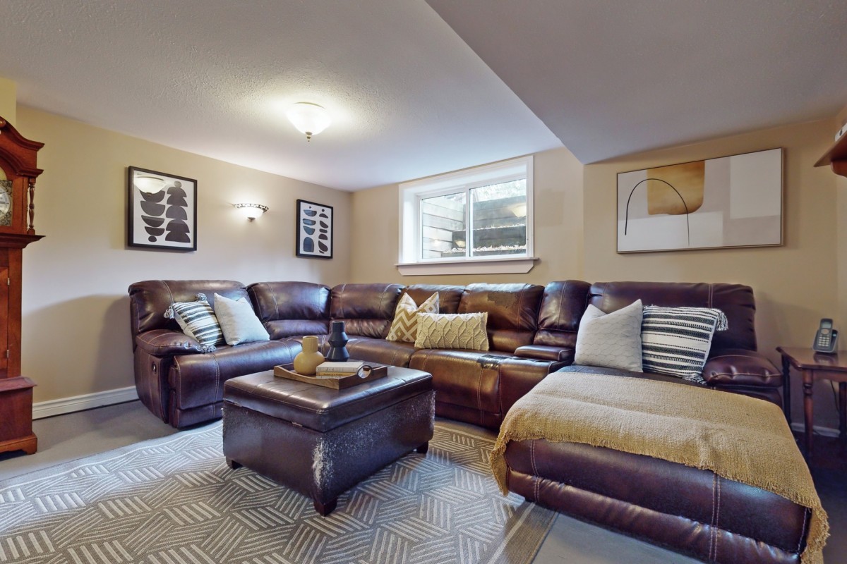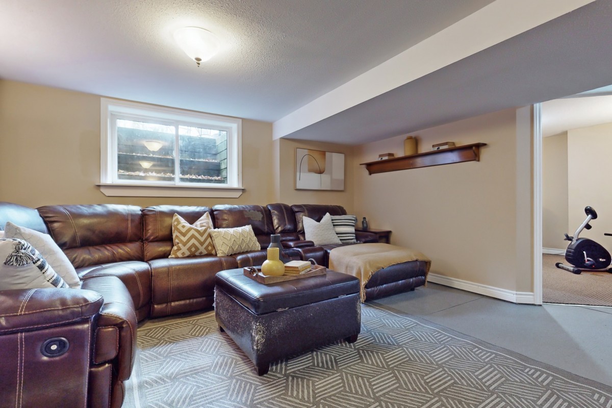 Finished basement with a bedroom/office, big rec room with built-in shelving and large window, and ample storage space.