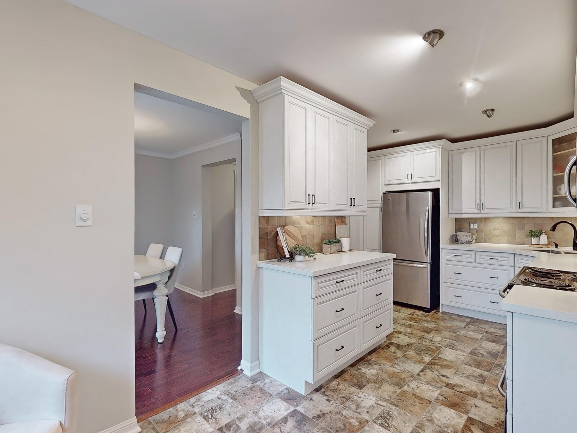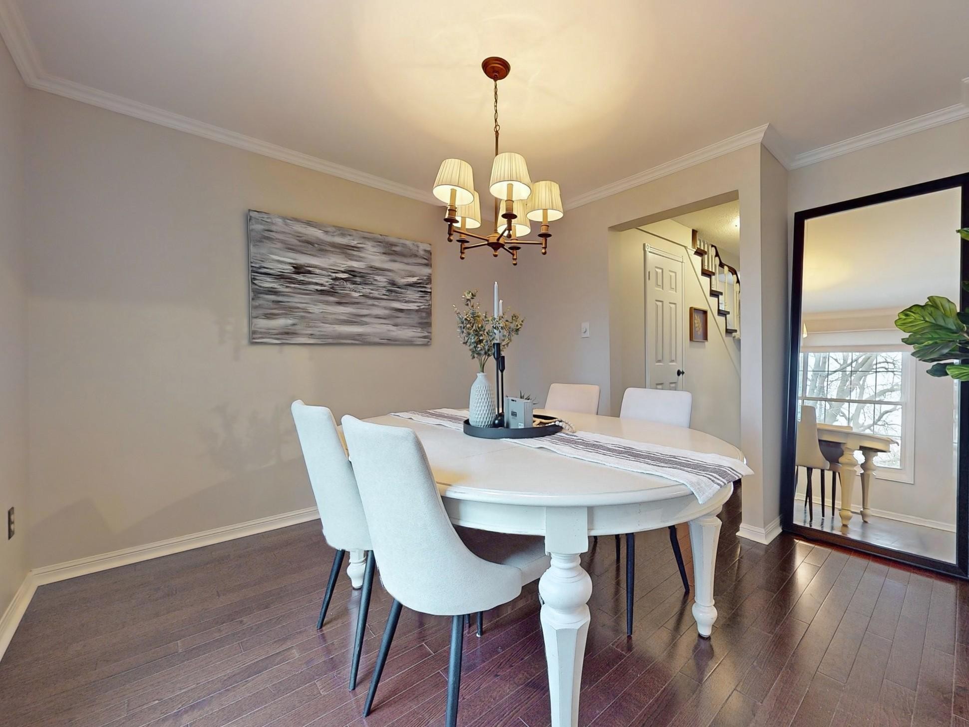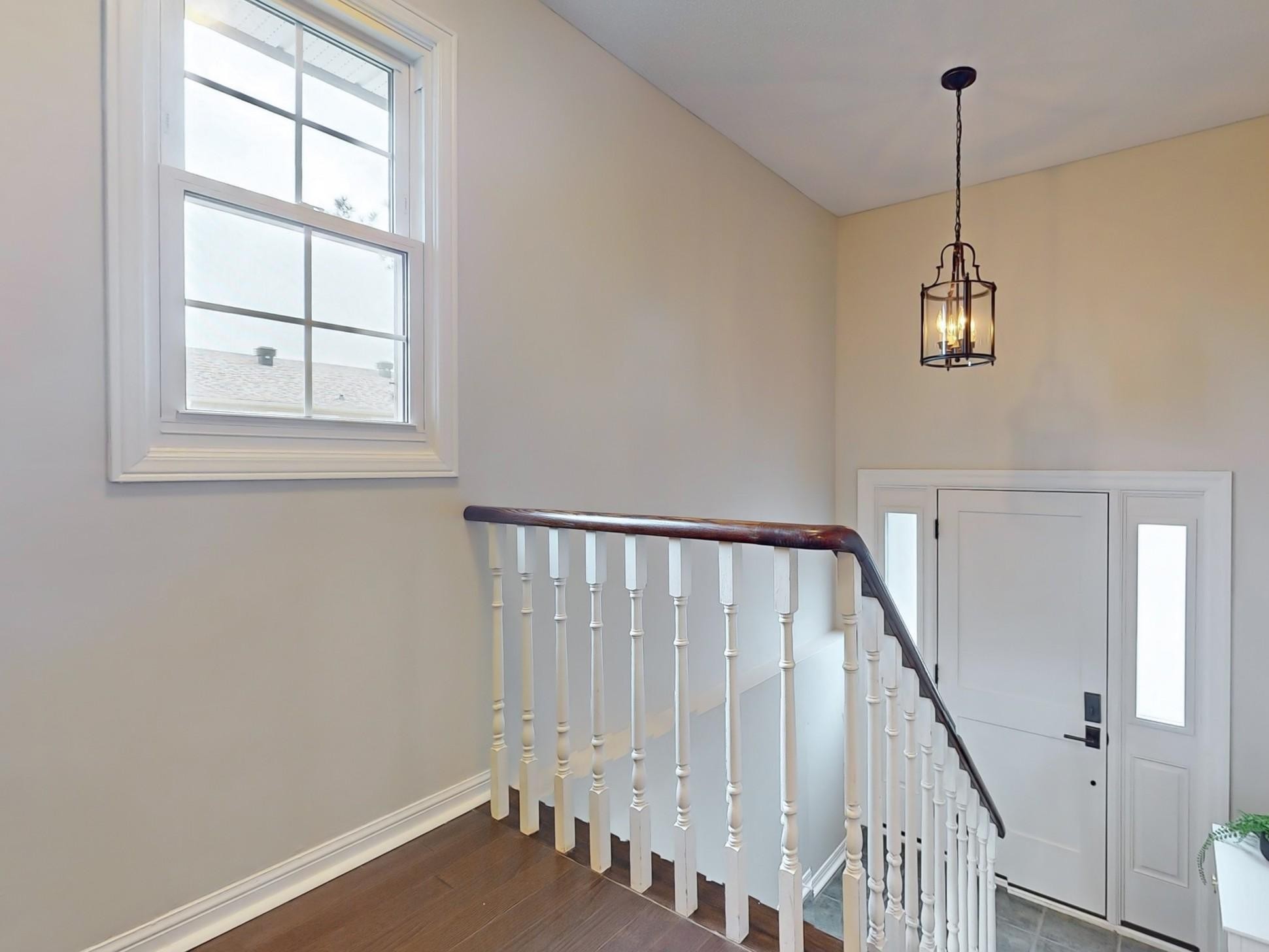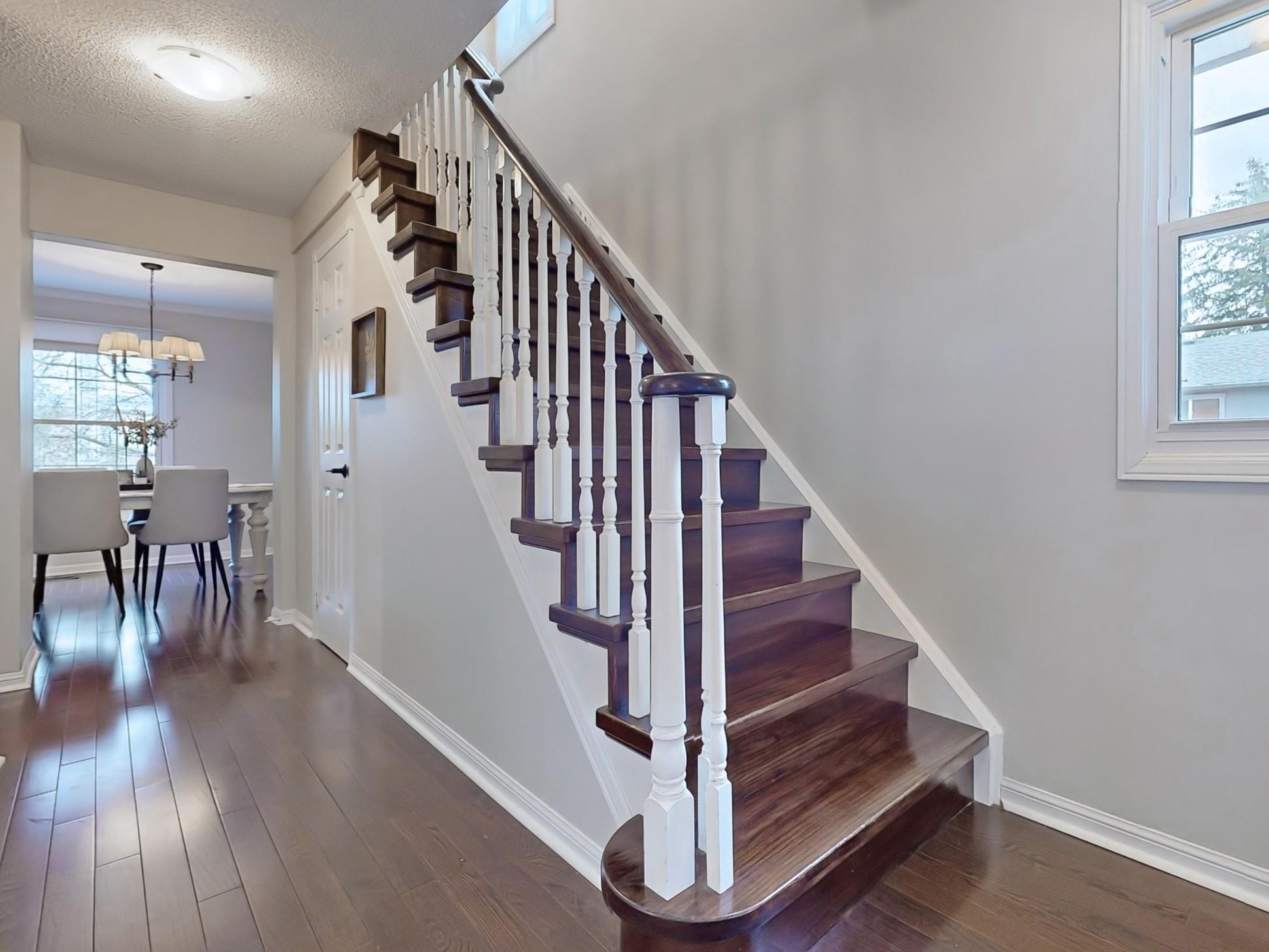 Enter through the regal front door, up the hardwood stairs and be greeted by an expansive living room with huge picture window. Continue on into the crisp white kitchen with quartz counters and under-valance lighting. The formal dining room overlooking the treed backyard is the perfect space for family meals and entertaining.