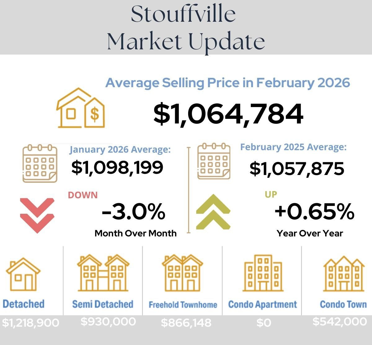 The Stouffville real estate market remained relatively stable in February 2026, with the average selling price at $1,064,784. This reflects a slight decrease of 3.0% month-over-month, while still showing a modest 0.65% increase year-over-year. Detached homes continue to lead the market in value, with semi-detached and townhome options providing more accessible opportunities for buyers. With balanced conditions and steady pricing, Stouffville continues to be an attractive market for both buyers and sellers looking for long-term value in a growing community.