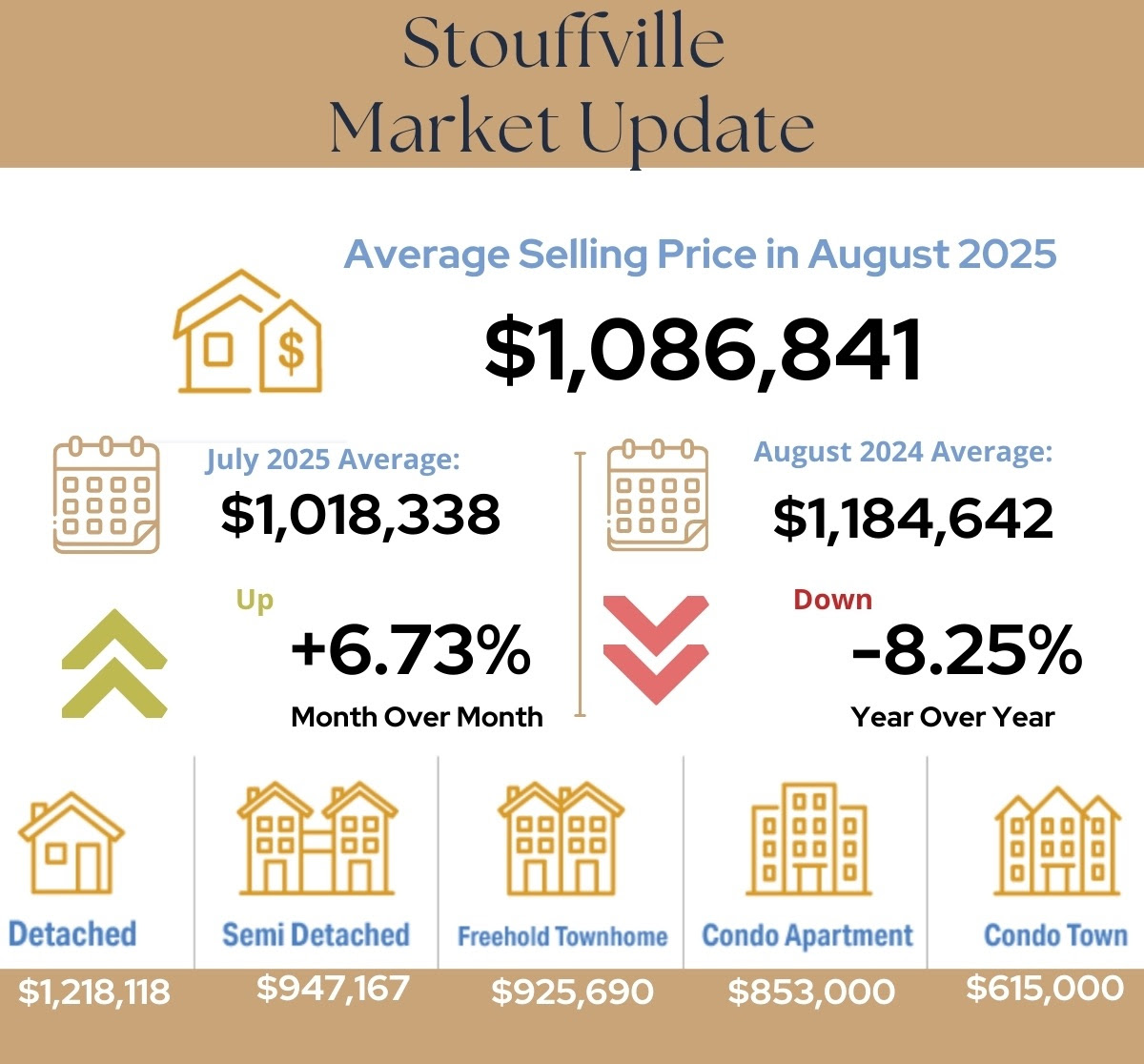 The Stouffville housing market strengthened in August 2025. The average selling price rose to $1,086,841, up 6.73% month-over-month from July, while remaining 8.25% lower year-over-year compared to August 2024. Detached homes continued to lead the market with an average price of $1,218,118, followed by semi-detached homes at $947,167. Freehold townhomes averaged $925,690, condo apartments came in at $853,000, and condo townhomes averaged $615,000. Overall, August reflected renewed buyer activity and price momentum compared to earlier in the summer, despite ongoing year-over-year softness.