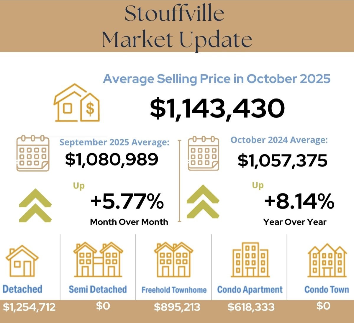The Stouffville housing market gained momentum in October 2025. The average selling price increased to $1,143,430, up 5.77% month-over-month from September and 8.14% year-over-year compared to October 2024. Detached homes continued to anchor the market with an average price of $1,254,712. Freehold townhomes averaged $895,213, while condo apartments sold for $618,333. There were no recorded sales for semi-detached homes or condo townhomes during the month. Overall, October reflected renewed buyer confidence and stronger pricing, driven by limited inventory and a higher share of detached home sales.