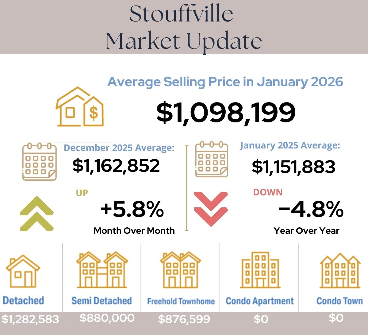 The Stouffville market showed steady movement in January 2026, with the average selling price at $1,098,199, reflecting a 5.8% increase from December 2025 while sitting 4.8% below January 2025 levels. Detached homes continued to lead the market at an average of $1,282,583, followed by semi detached homes at $880,000 and freehold townhomes at $876,599, with little to no condo activity reported this month. Overall, the data points to positive short term momentum month over month, alongside a market that remains slightly softer compared to last year.