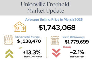 For condos, the average selling price in Unionville was $799,731, showing a 2.46% decrease from February 2025’s $819,903, but a 7.34% increase year-over-year compared to March 2024’s average of $745,054.